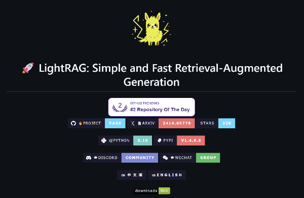 - 현재 위상: 공개 초기부터 폭발적인 관심을 받으며 깃허브 스타 2만 개 이상을 기록하는 등, 현재 가장 주목받는 오픈소스 RAG 프레임워크 중 하나 (LightRAG 공식 GitHub 저장소)