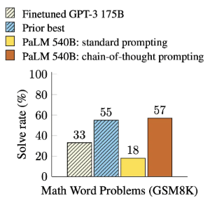 CoT 는 산술적, 상식적, 그리고 상징적 추론 과제들과 같은 과제들에서 결과를 향상시키는 효과를 보여주었습니다. 특히 아래 그림에서 확인할 수 있듯이 prompted PaLM 540B 는 GSM8K 에서 57% 정확도를 달성하였습니다.
