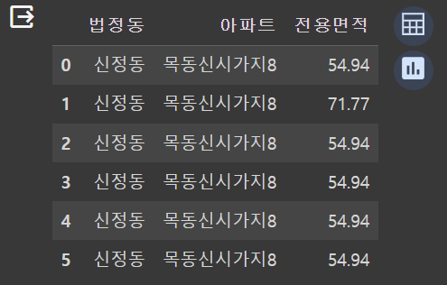 위에 화면을 보면 2023년 5월에 목동신시가지 8단지 아파트 6채가 거래되었는데, $54.94m^2$이 5채, $71.77m^2$이 1채인 것을 알 수 있습니다. 위의 데이터에서 거래된 아파트 이름과 전용면적을 알기 위해 dataframe에서 중복 데이터를 찾고, 제거하는 방법에 대해 알아보겠습니다.